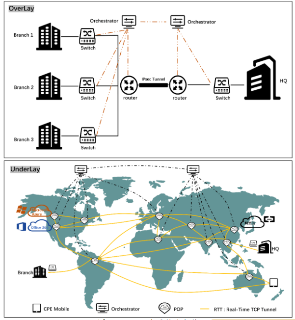 SD-WAN將基礎網絡分為了Underlay和Overlay兩層。Underlay是底層網絡,負責互聯互通,ISP打通路由即可。Overlay把Underlay網絡虛擬化,通過SDN控制器分發路由控制及流量調度,根據企業組網規模或網絡拓撲選擇不同的路由協議。Overlay隧道技術存在多種,傳統技術包括源自數據中心的VxLAN,源自網絡的IPSec、GRE等,流量在指定源、目的端點之間進行轉發,不能指定或者變更轉發路徑。一條完整的路徑通常需要多條隧道拼接而成,并且隧道的配置涉及整條鏈路的不同設備。傳統技術如果要為海量客戶的不同業務提供精細化服務,實現過程非常復雜;SD-WAN依托云端或運營商的POP節點來連接CPE,企業分支機構探測和選擇最佳的POP節點并建立連接,通過在POP中部署vCPE或網關設備,在CPE與POP節點之間建立VPN隧道,實現用戶側與資源側的連接。